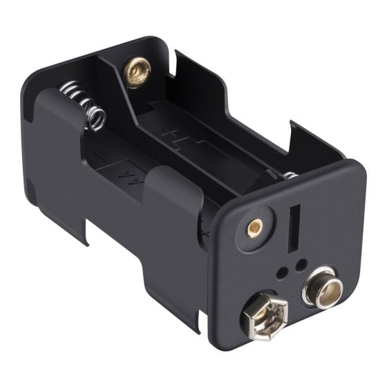 Porta-pilas para 4 baterías tipo AA, fabricado en plástico ABS negro, con broche tipo 9 V en la cabecera. Se usa principalmente en tablillas de conexión (Protoboard) o para alimentar cualquier prototipo de circuitos electrónicos.